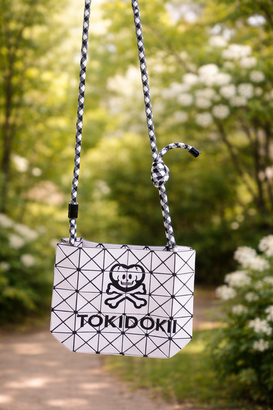Trendy geometric print sling bag for women with adjustable rope strap, lightweight design, and compact storage—perfect for daily casual use.