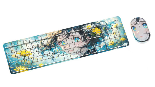 Anime floral-themed keyboard, mouse, and large desk mat combo with smooth performance and elegant design for office or gaming use.